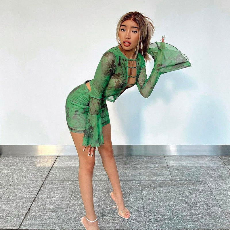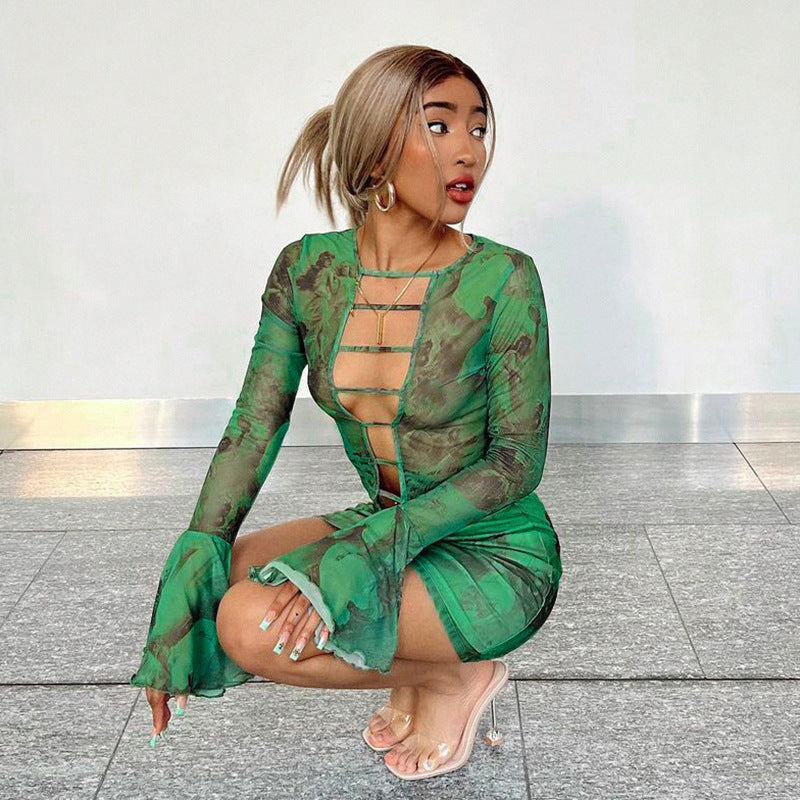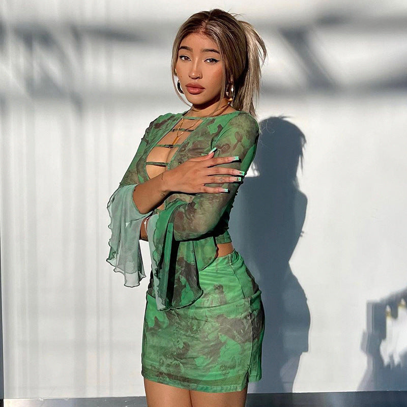 Flared Hollow Top Hip Skirt Chiffon Printing Suit