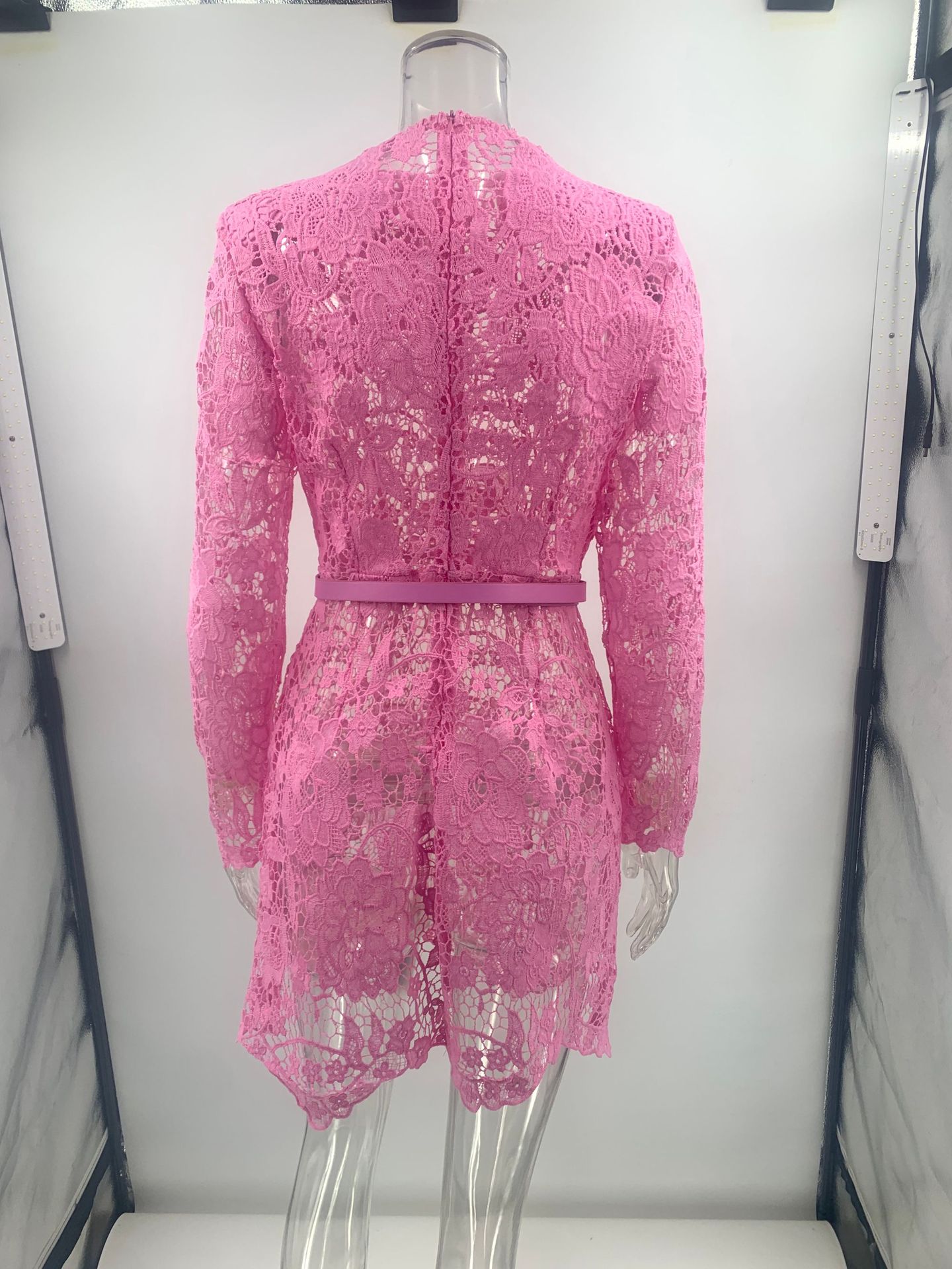 Lace Sheer Cutout Belted Slim-fit Long-sleeve Mini Dress
