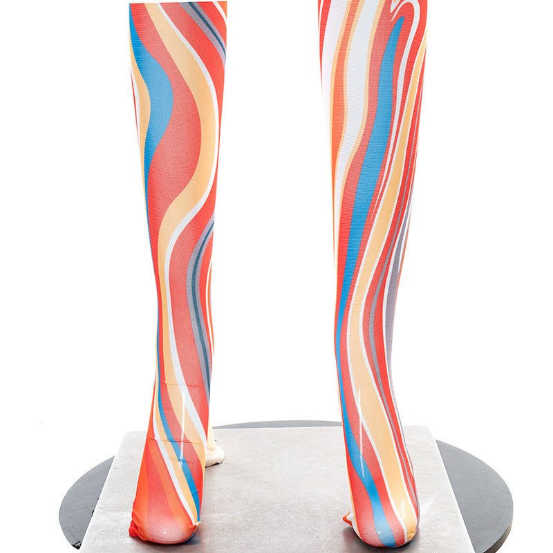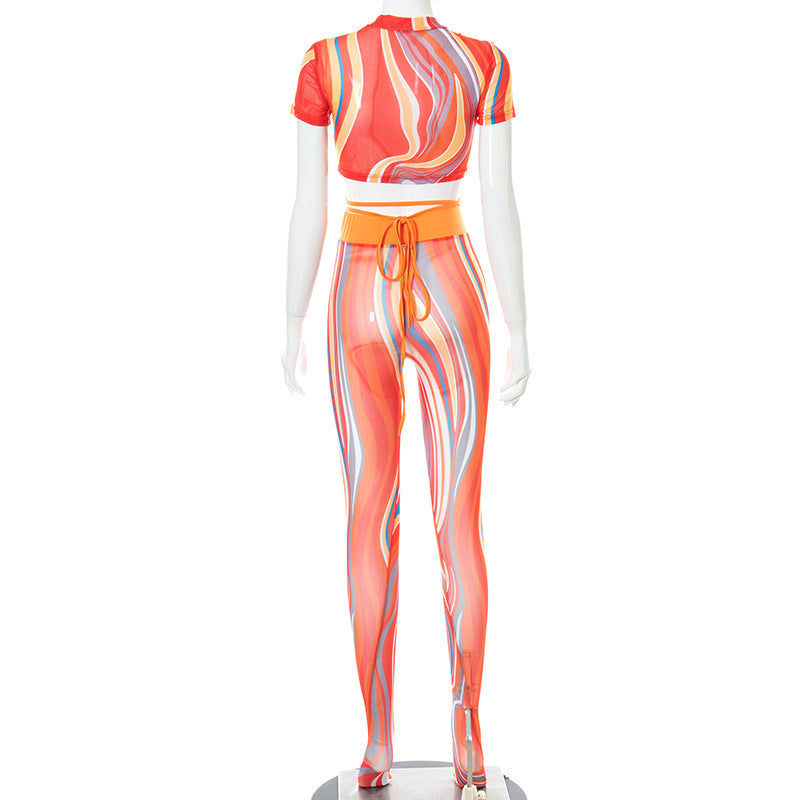 Printed Lace Up Body Stocking Casual Suit Tie-dye Waist Tether Short Sleeve Mesh Pantyhose