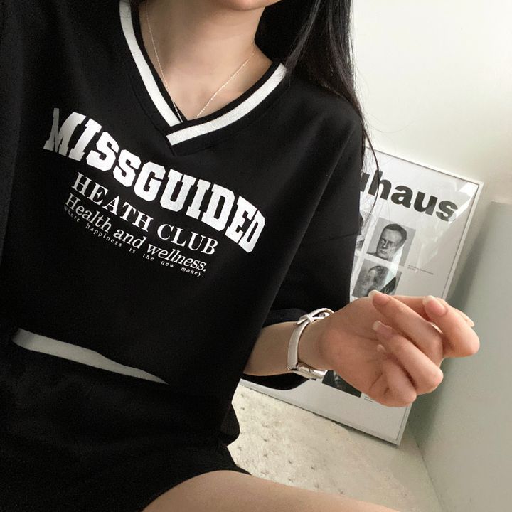 V-neck Women's Short-sleeved Shorts Two-piece Set Solid Color