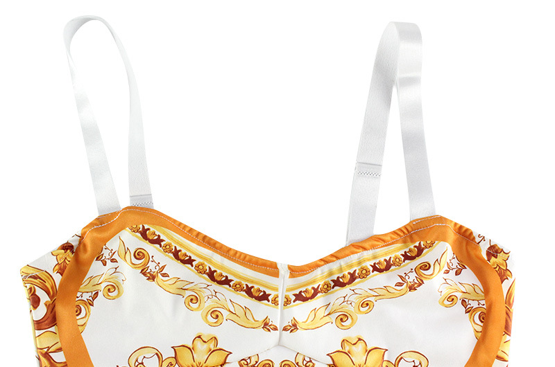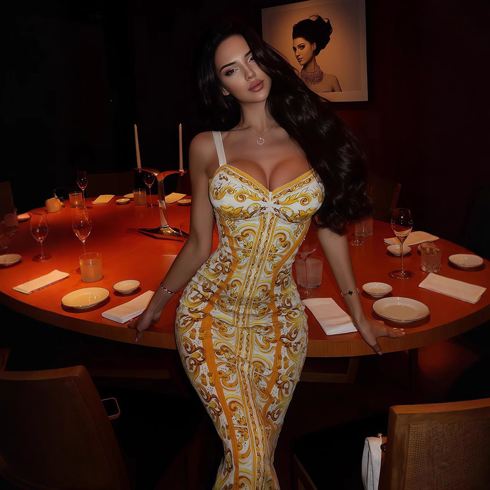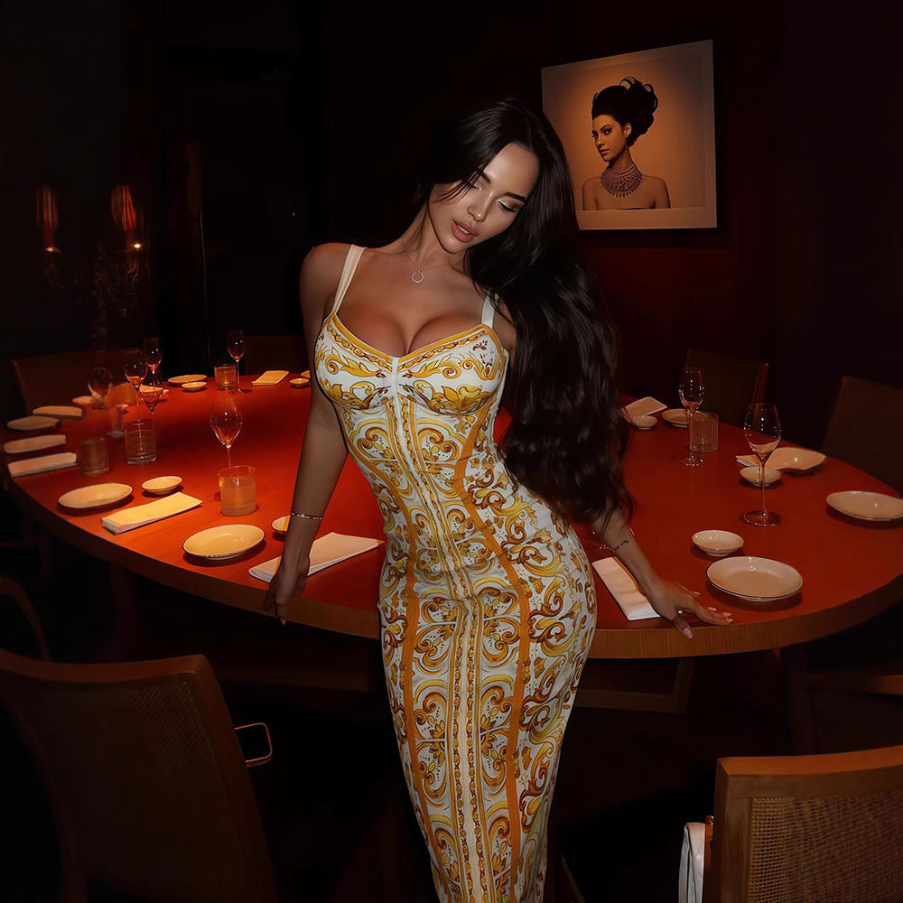 Women's Elegant Retro Printed Sleeveless Slip Dress With Waist-Cinching Design For A Slimming Look