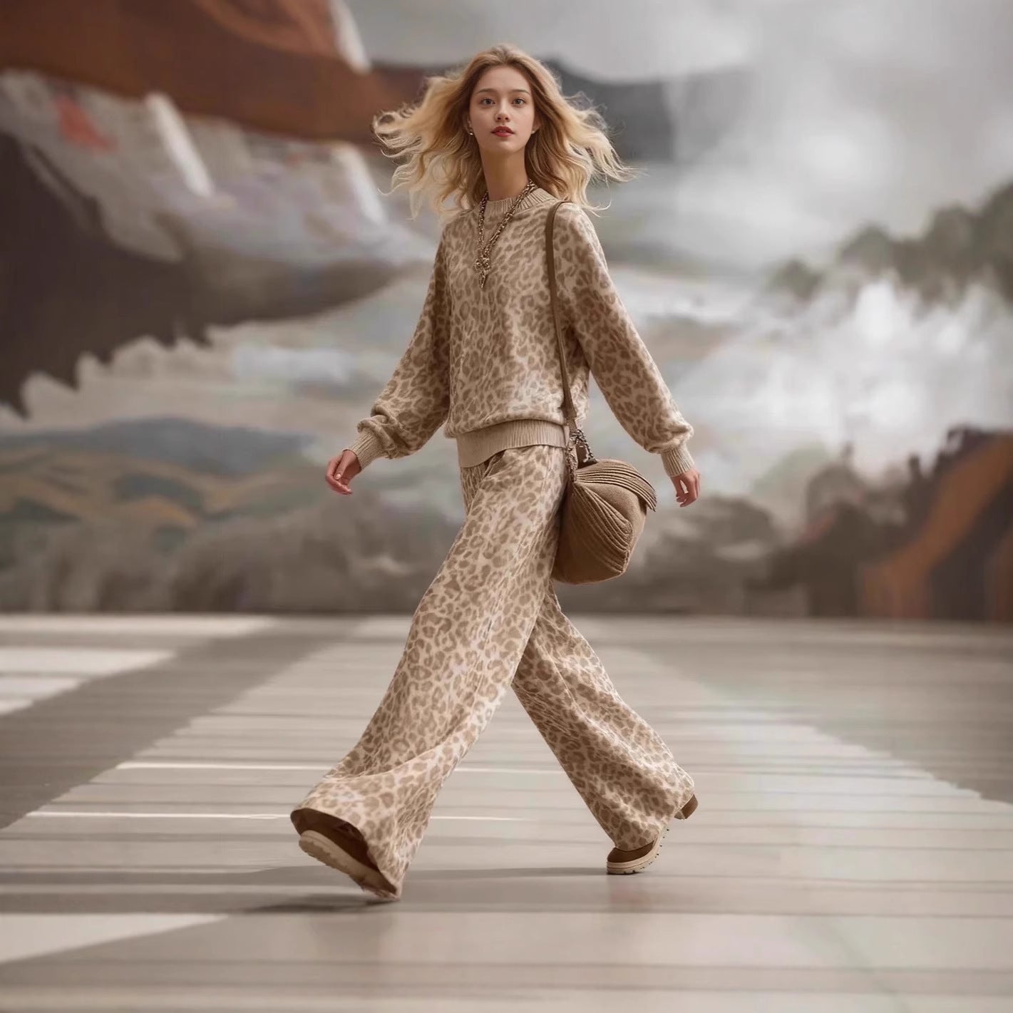 Women's Retro Casual Light Brown Leopard Print Long Sleeve Slim Fit Sweatsuit